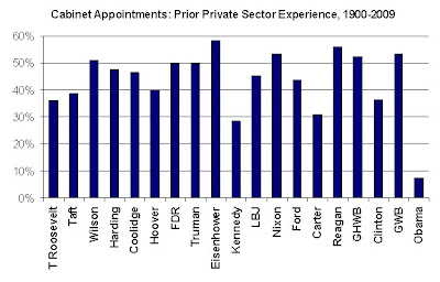 When one considers that public sector employment ( local, state and federal government employees )  has ranged since the 1950s at between 15 percent and 19 percent of the population, the makeup of the current cabinet—over 90 percent of its prior experience was in the public sector—is remarkable.  In the midst of a recession of almost-historic proportions, we see a President who insists on actively ignoring any input from people whose experience gives them unique insight into the problem. Seem foolish to you too?