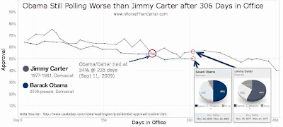Another impressive Obama accomplishment has been that, for the entire period of his first 306 days in office, Obama's job approval was been as low or lower than Pres. Carter's: